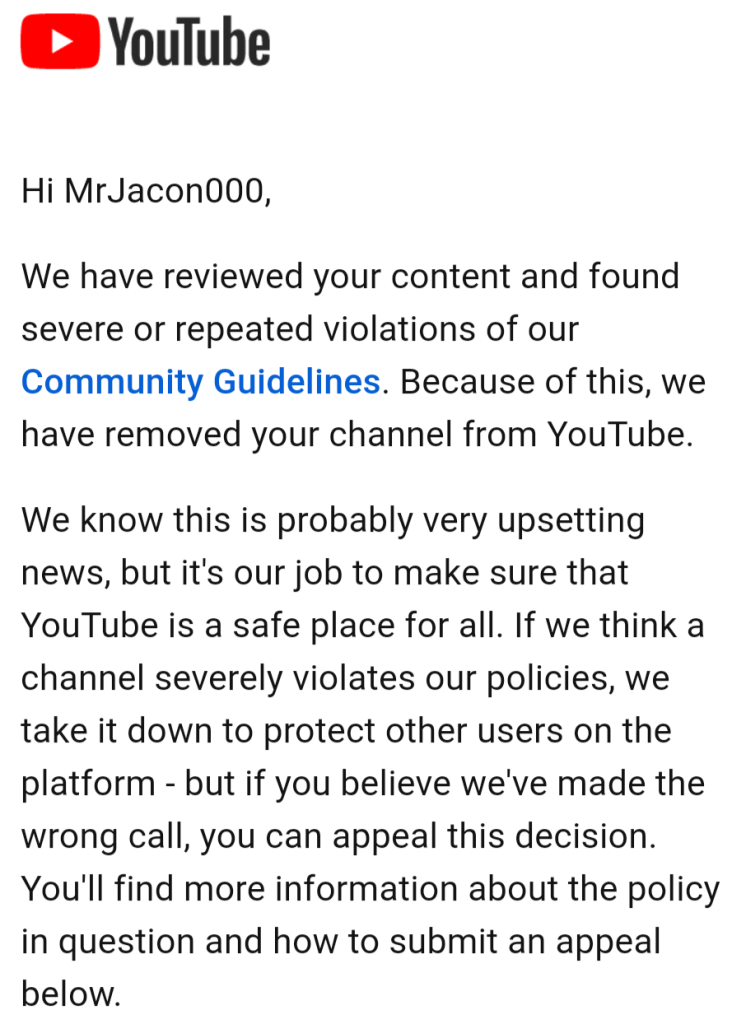 On April 26th, 2021, I received an email from YouTube stating that my MrJacon000 channel was terminated due to “spam, scams, and commercially deceptive content.” This was an absolute shocker, as I’ve never received a strike in a very long time, nor have I had any active strikes. Of course, I’ve tried to appeal their decision, thinking that it may have been an overreaction to my older content dating back to late 2011 that could have triggered something. This was also the time when YouTube was reviewing my channel because I had reached the YouTube Partner Program (YPP) threshold of 1,000 subscribers and 4,000 watch time hours in 1 year. I think during the review period, they saw something remotely disturbing that “broke” their community guidelines to have that channel banned. About a few days later, I got an email back from YouTube about my appeal, and they basically said, “We’re standing by our decision to keep that channel banned because it violated our guidelines.” I was utterly confused about exactly why and what videos made my channel to get banned. Yeah, I had some videos that were fine when they were uploaded back in the day. Some were still on that channel, and some were deleted, hoping to not get any community guidelines strikes in the past. I think a possible motive for YouTube’s decision to ban that channel was having at least two in-depth tutorial videos on cracking Vegas Pro 13 and 14. They were once public, with views of approximately 7,500–15,000 each, until both videos got privated about a couple years later. It’s not known to this date what exactly caused YouTube to ban my old channel.